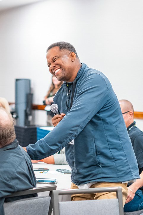 - Close-up moments where participants are asking questions, collaborating, or presenting back to the group.